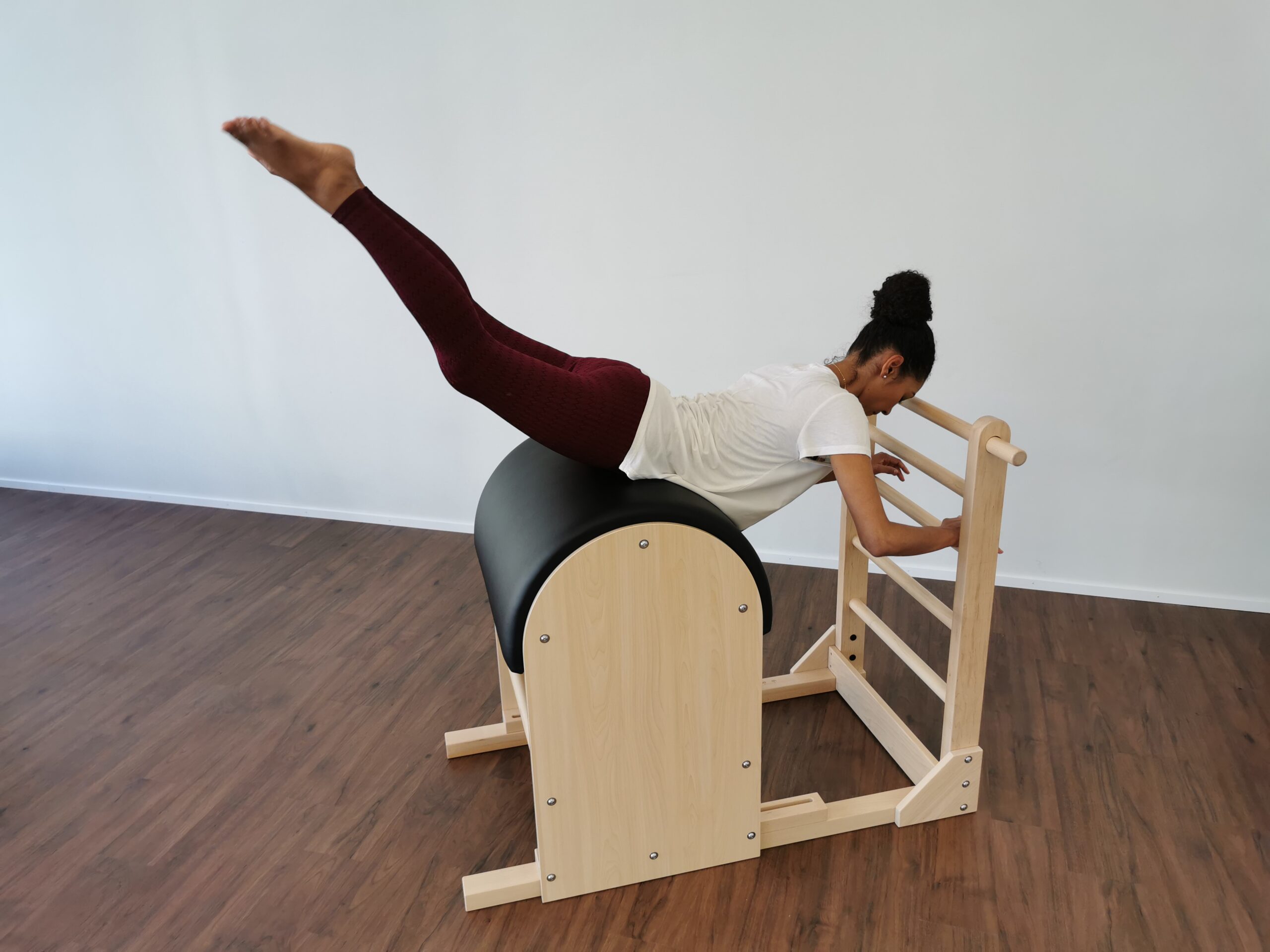 Barrel hilft bei der Isolierung der tiefen Haltungskontrollmuskeln und fordert den Körper auf allen Bewegungsebenen heraus. Zum Beispiel eine Übung, bei der Sie auf dem Lauf sitzen, mit gesicherten Füßen auf den Stufen der Leiter positioniert sind, dann den Rücken über den Lauf wölben, wobei Ihre Wirbel dem Umriss folgt. Danach die tiefen Bauchmuskeln aktivieren und kontrolliert zur Startposition zurückkehren. Bei anderen Übungen schauen Sie mit dem Bauch auf dem Lauf in die andere Richtung, wodurch Sie eine unterstützte Wirbelsäulendehnung erhalten, die hilft, Verspannungen zu lösen.